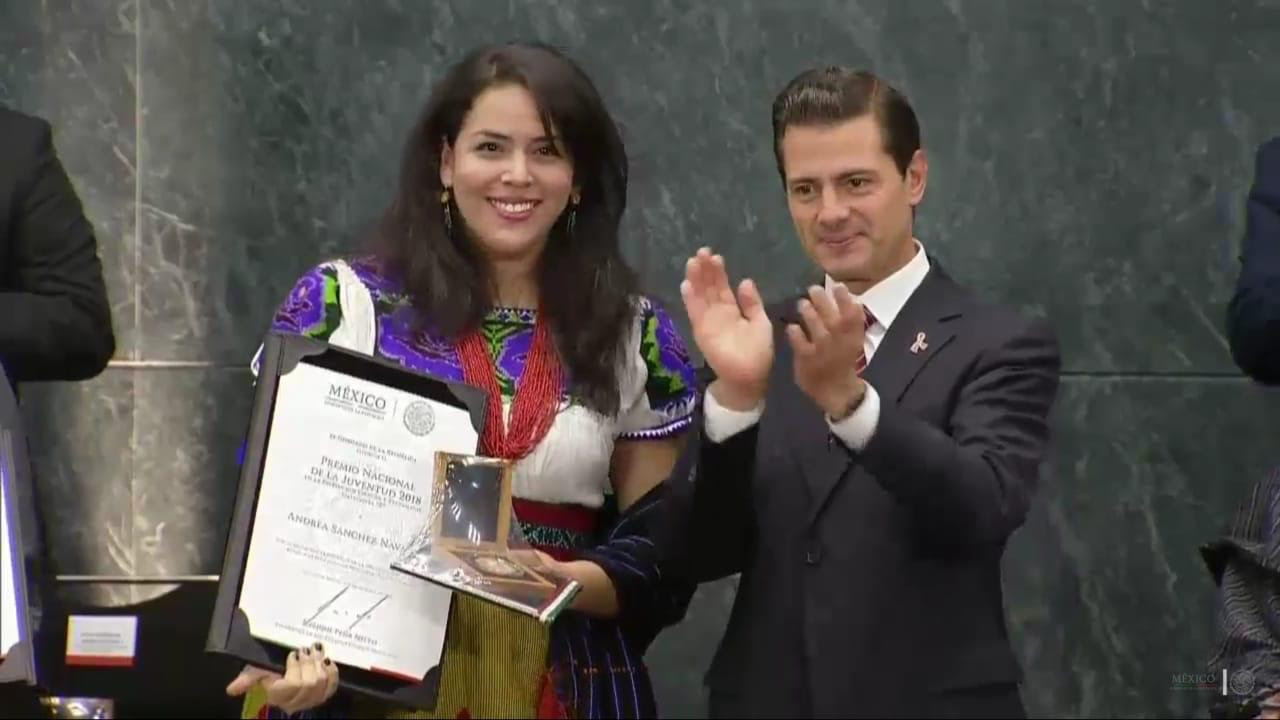 Morelia, Michoacán, a 16 de octubre de 2018.- Esta tarde, la michoacana Andrea Sánchez Navarro recibió el Premio Nacional de la Juventud 2018, de manos del Presidente de la República, Enrique Peña Nieto, en la categoría B de Ciencia y Tecnología, con lo que pone en alto el nombre de Michoacán y de México.