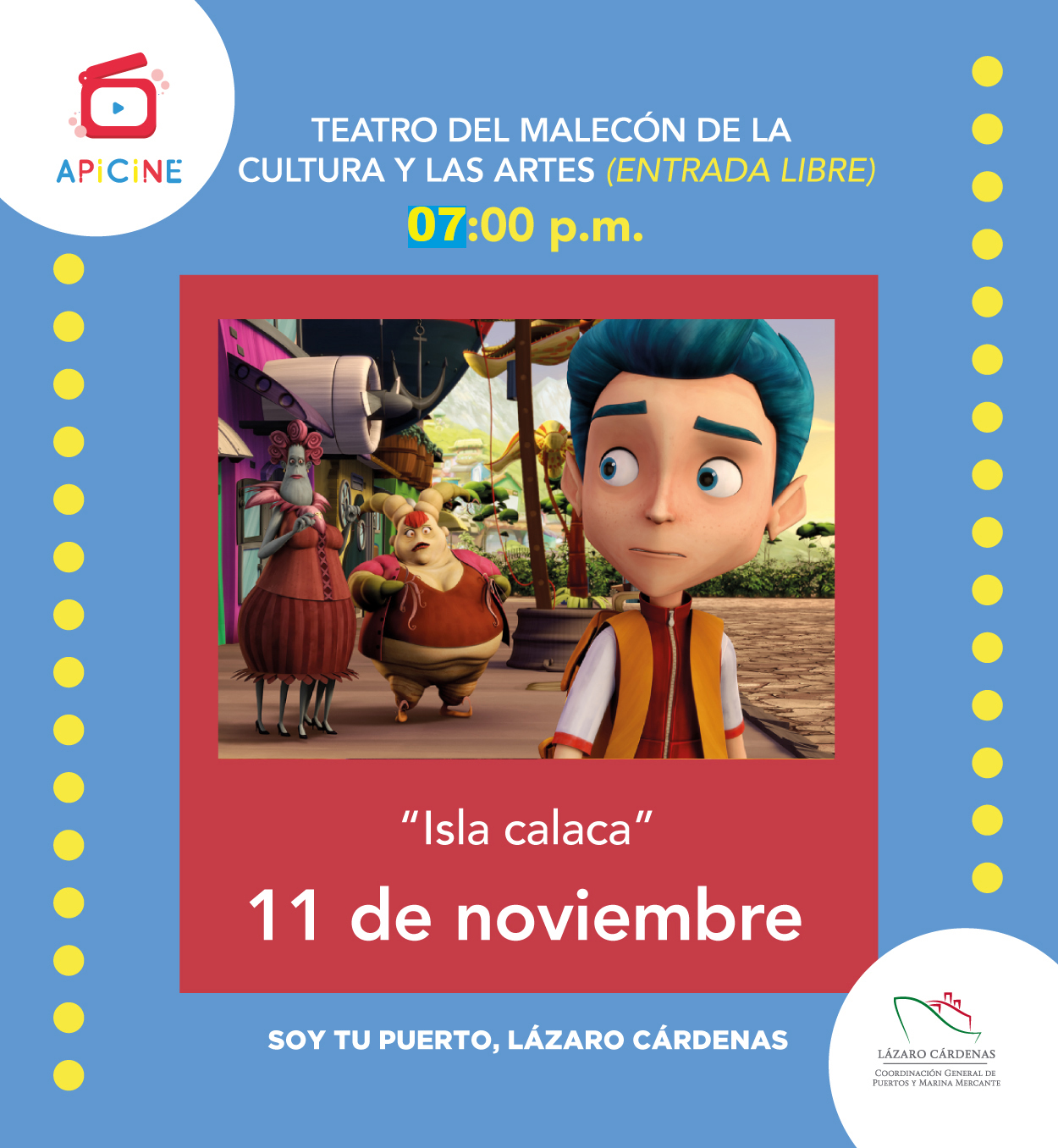 Puerto Lázaro Cárdenas, 06 de noviembre de 2018.- El Puerto Lázaro Cárdenas presenta la función de APIcine, misma que se realizará este domingo 11 de noviembre a las 19:00 horas en el Teatro del Malecón de la Cultura y las Artes para disfrutar de la película “Isla Calaca”.