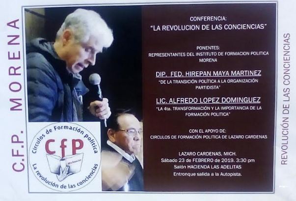 Le sigue la conferencia “De la Transición Política a la Organización Partidista” por el ponente el Diputado Federal Hirepan Maya Martínez, la “Cuarta transformación y la importancia de la formación política”, a cargo del Licenciado Felipe López Domínguez, sobre las transformaciones históricas del país.
