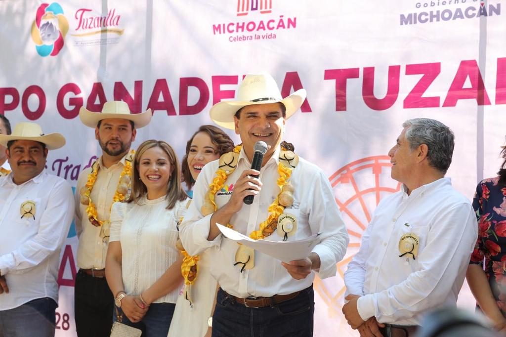 El mandatario estatal destacó que el Gobierno del Estado ha logrado entregar más de 200 sementales y 150 vaquillas, además de que se ha fortalecido la infraestructura con la edificación de 73 bodegas y 120 corrales en lo tres últimos años, con el objetivo de apoyar a Tuzantla en el desarrollo de su principal actividad económica.