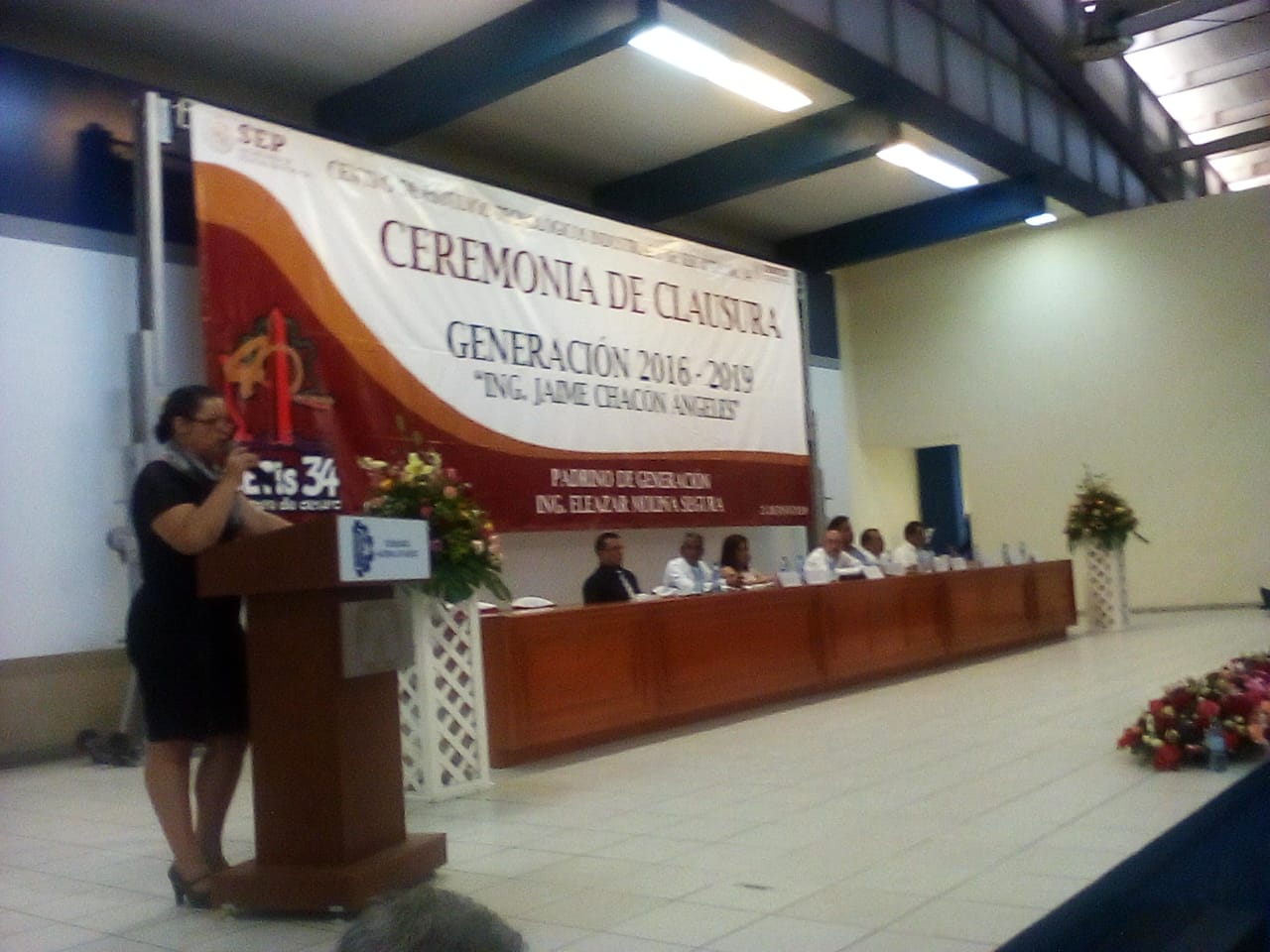 “Como Directora del plantel dijo comparto ese orgullo personal, colectivo y familiar porque este evento es producto de esfuerzos conjuntos, y así es como visualizamos nuestro trabajo en la administración y planeación educativa del plantel, con una visión de beneficios colectivos al corto, mediano y largo plazo”, expuso al compartir el mensaje, Ana María Pérez Romero, Directora del Cetís-34.