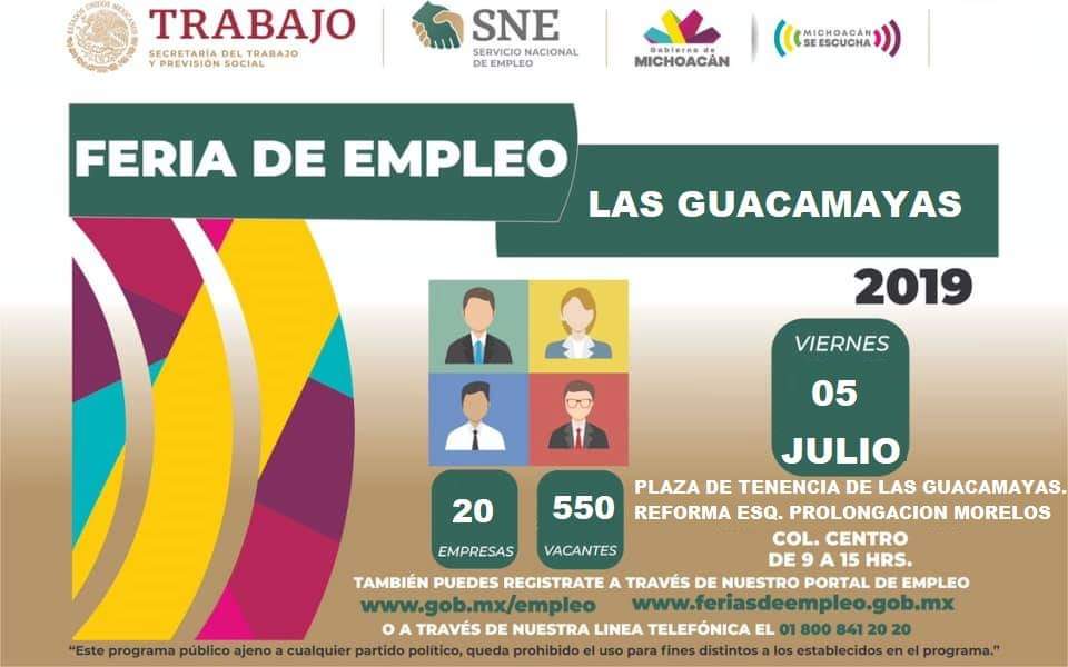 LÁZARO CÁRDENAS, MICH.- El Servicio Nacional de Empleo (SNE) de la Secretaria de Desarrollo Económico (Sedeco) promueve el empleo formal en la entidad, en esta ocasión con “La Feria del Empleo Estatal Las Guacamayas 2019”, que se realizará en el municipio de Lázaro Cárdenas, en donde se expondrán 550 vacantes de 20 empresas locales, así lo dio a conocer el titular de la oficina regional del Servicio Nacional del Empleo en Lázaro Cárdenas.