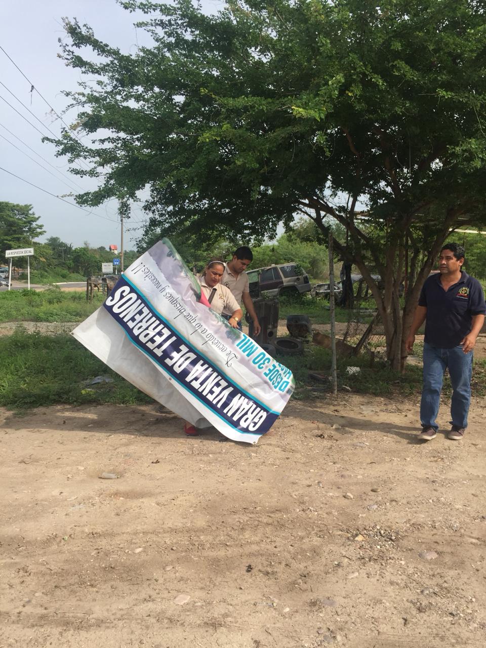 CD, LÁZARO CÁRDENAS, MICHOACÁN, A 01 DE AGOSTO DEL 2019.- En días pasados, el departamento de Planeación y Ordenamiento Urbano retiró publicidad relacionada a la venta de terrenos en el tramo carretero de La Orilla a la tenencia de Buenos Aires.