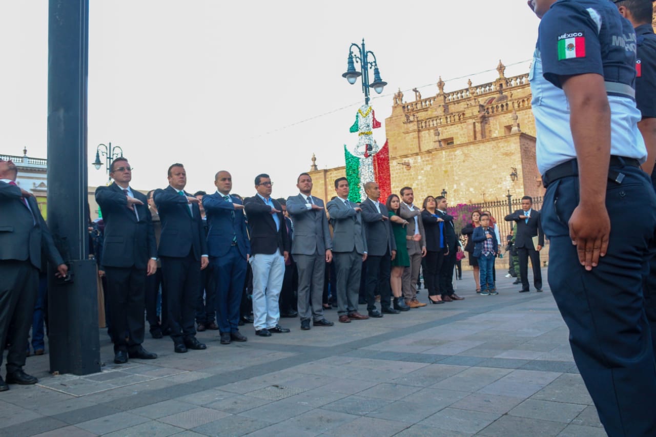 Trabajadoras y trabajadores de las dependencias del Gobierno del Estado, participaron en el izamiento del Lábaro Patrio y entonaron el Himno Nacional en la Plaza Melchor Ocampo, de la ciudad de Morelia.
