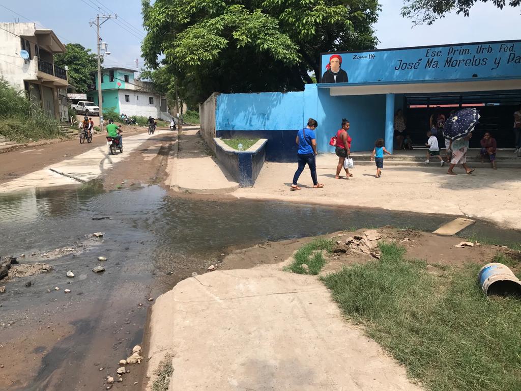 *Existe un escurrimiento de agua de drenaje en la escuela primaria José María Morelos en la Tenencia de Las Guacamayas.