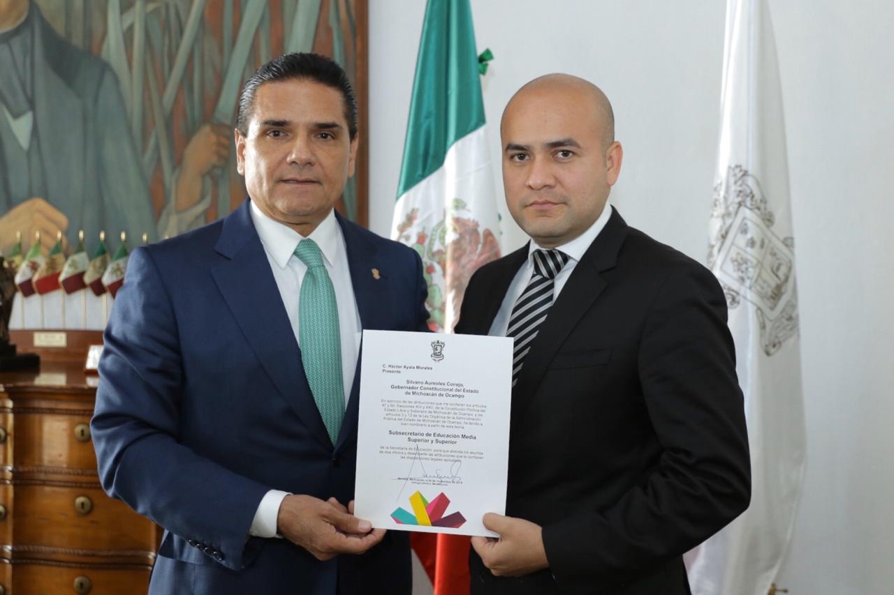 Morelia, Michoacán a 4 de noviembre de 2019.- Ante los avances obtenidos para la federalización de la nómina educativa en Michoacán, el gobernador Silvano Aureoles Conejo, oficializó el nombramiento de Héctor Ayala Morales como subsecretario de Educación Media Superior y Superior.