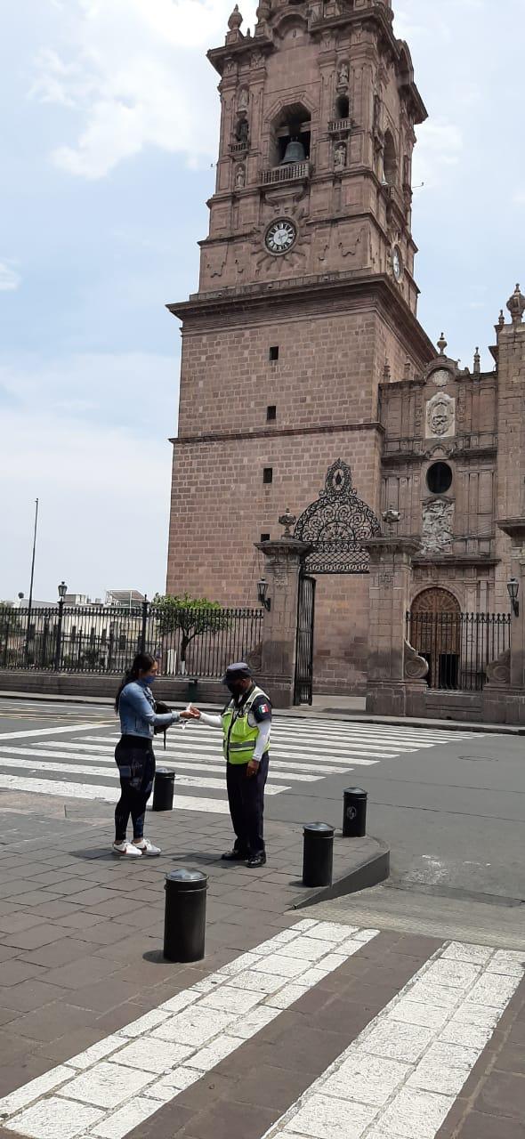 Morelia, Michoacán, a 25 de abril de 2020.- La Secretaría de Seguridad Pública (SSP), a través de la Dirección de Tránsito y Movilidad, continúa con la implementación de acciones preventivas para frenar la propagación del COVID-19, en esta capital michoacana, donde abordan a transeúntes y les distribuyen gel antibacterial.