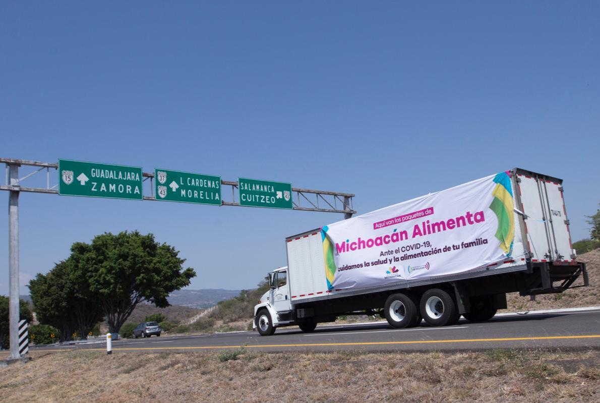 Cada uno de los camiones de carga puede ser reconocido por las lonas que cubren sus cajas, las cuales llevan una leyenda que simboliza el esfuerzo y solidaridad de todo un pueblo: “Aquí van los paquetes de Michoacán Alimenta”.