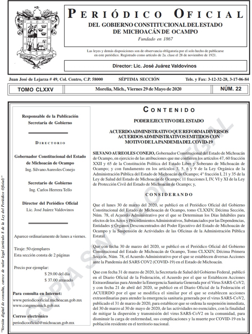 Las modificaciones instruidas por el Gobernador de Michoacán, Silvano Aureoles Conejo, quedaron plasmadas en el Acuerdo Administrativo publicado el 29 de mayo del presente año en el Periódico Oficial del Estado.