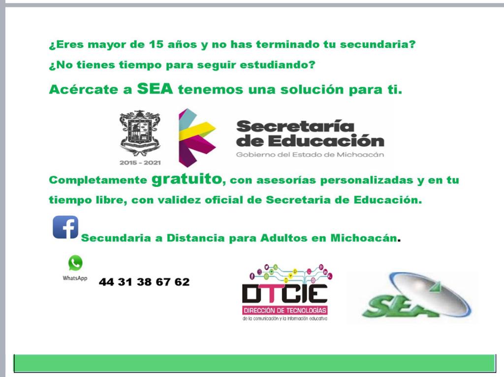 Con el propósito de combatir el analfabetismo y el rezago educativo, la Secretaría de Educación en el Estado (SEE), implementará en el municipio de Lázaro Cárdenas el programa de Secundaria a Distancia para Adultos (SEA), este proyecto, que tiene 15 años de operación en la capital michoacana, está dirigido a personas adultas que quieren estudiar su secundaria y no pueden acudir diariamente a una escuela, así como a jóvenes mayores de 15 años que no hayan concluido su educación secundaria, por lo que se les brinda la posibilidad de obtener el certificado de estudios de secundaria con validez oficial de manera gratuita.