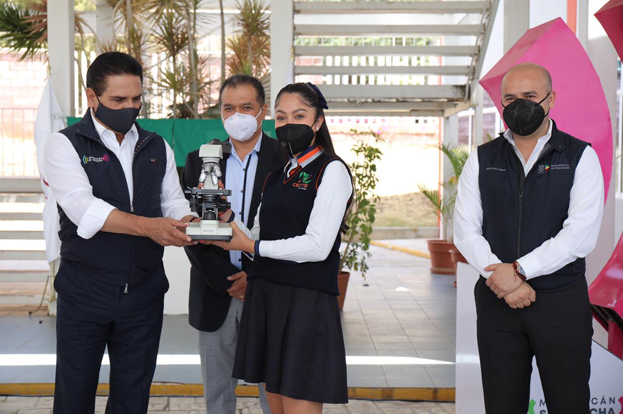 “Quiero felicitarlo Gobernador por la entrega de tan excelentes equipos médicos y mobiliario que afianzan nuestro rumbo hacia la excelencia”, expresó la alumna del sexto semestre de Laboratorista Clínico, plantel Morelia, Liz Yareli Manuel Hernández.
