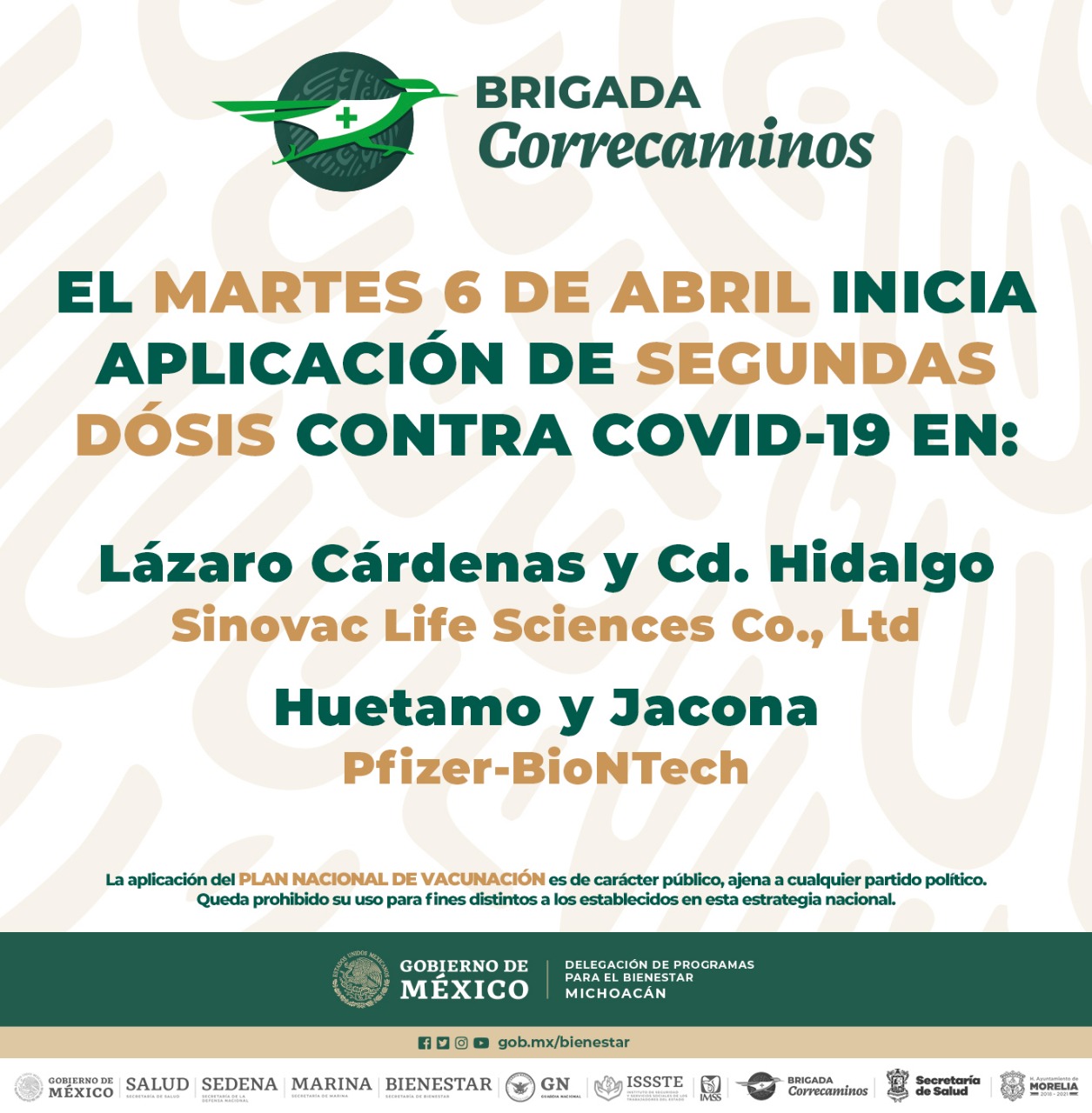 Cabe destacar que el Gobierno de México envió el pasado 09 de marzo a Lázaro Cárdenas y Ciudad Hidalgo, vacunas Sinovac Life Sciences Co., Ltd, cuya farmacéutica recomienda aplicar la segunda dosis entre 28 a 35 días después de la primera.