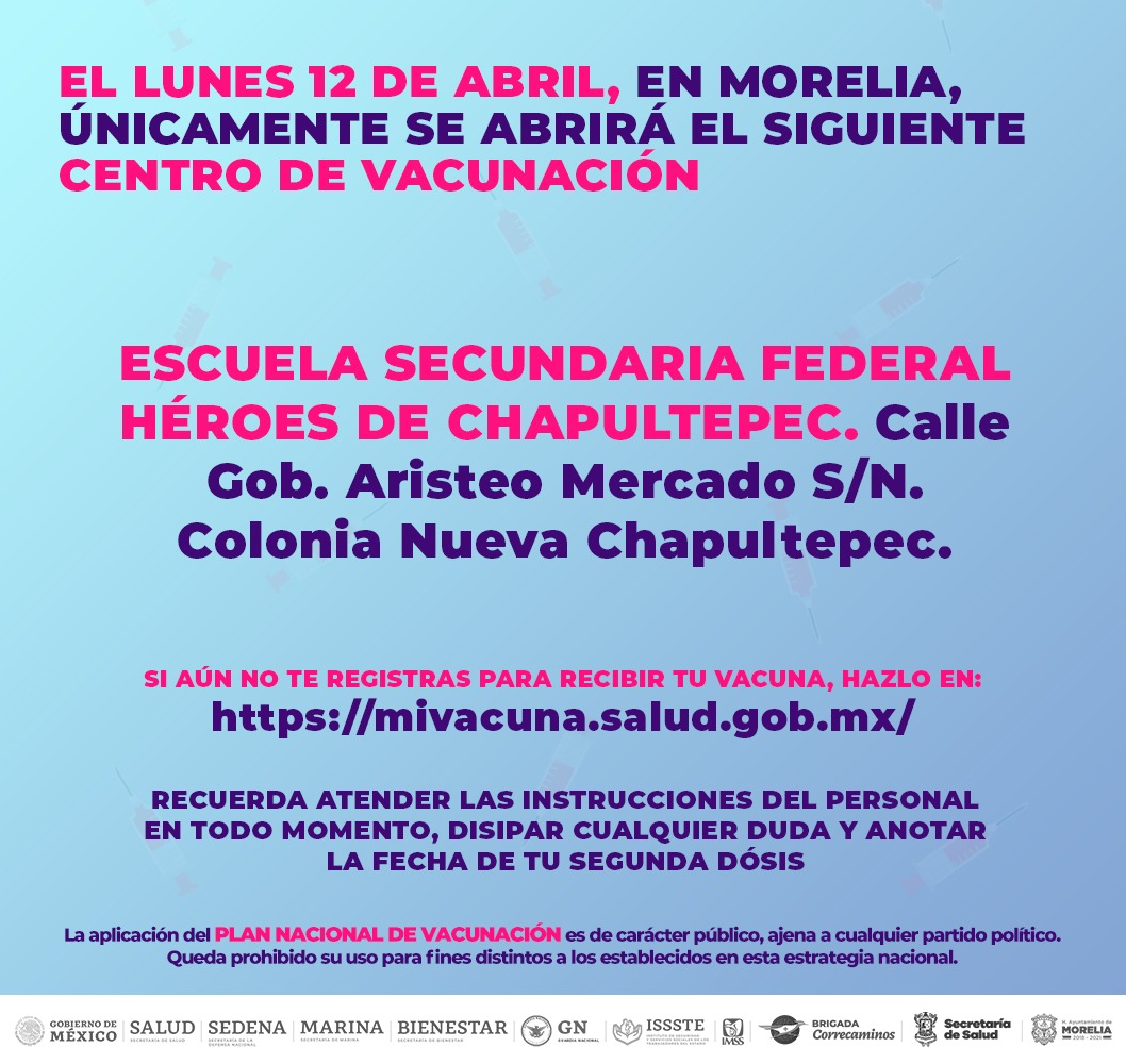 Mañana abrirá el centro de vacunación en la Escuela Secundaria Federal #5, “Héroes de Chapultepec”, en la calle Gobernador Aristeo s/n, en la col. Nueva Chapultepec.
