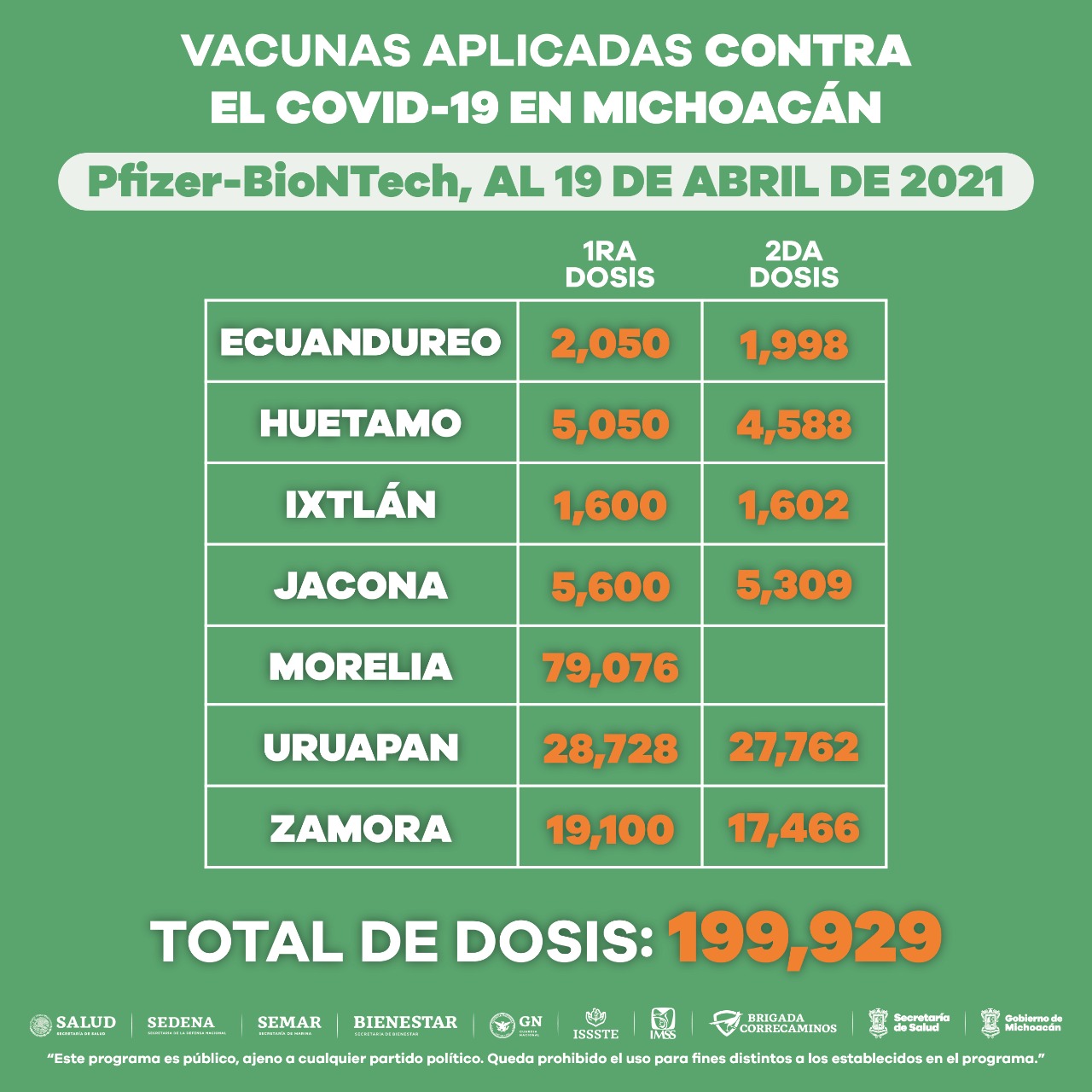 La Secretaría de Salud de Michoacán (SSM), informa que, en el caso de las personas que recibieron una de las 142 mil 922 dosis de CanSino Biologics, su esquema de vacunación ya está completo, debido a que esta es de una sola aplicación.