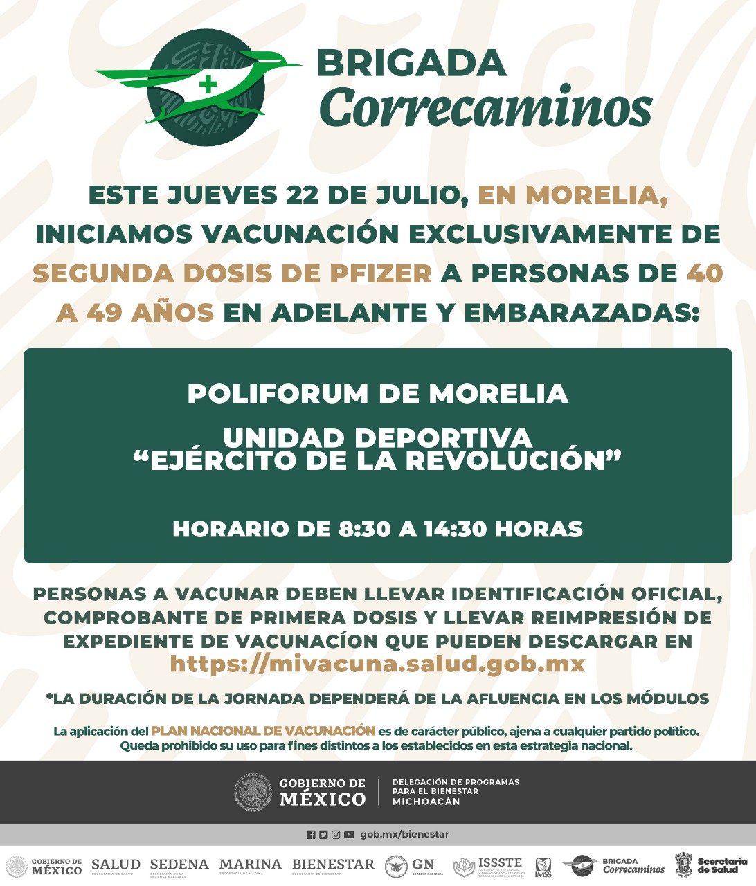 Tentativamente esta jornada de vacunación en Morelia se desarrollará los días 22, 23, 26, 27, 28, 29 y 30 de julio del presente año, lo cual dependerán de la afluencia en los módulos. Si hay cambios, se darán a conocer oportunamente.