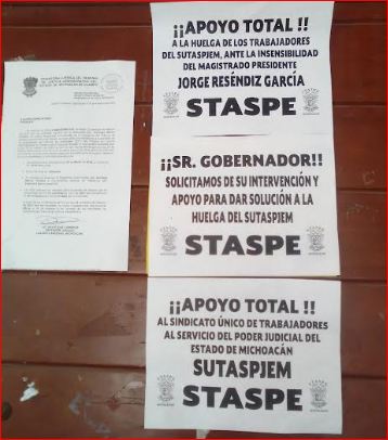 LÁZARO CÁRDENAS, MICH.- Trabajadores del Sindicato de Trabajadores al Servicio del Poder Ejecutivo (STASPE) decidió ofrecer su “apoyo moral” y en especie a los trabajadores del Poder Judicial, quienes mantienen una huelga de puertas abiertas. El Delegado Distrital del STASPE en este puerto Álvaro Gerardo Partida Núñez, expresó que, en las oficinas de gobierno estatal, se puede leer un letrero “apoyo total a la huelga de los trabajadores del Sindicato Único de Trabajadores al Servicio del Poder Judicial del Estado de Michoacán (SUTASPJEM), ante la insensibilidad del magistrado presidente Jorge Reséndiz García”.