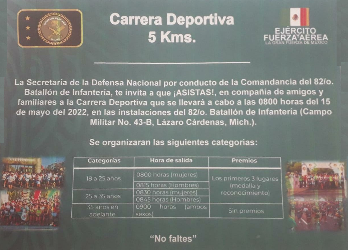 De acuerdo al cartelero de la Sedena que dice; Carrera deportiva 5 km la secretaría de la defensa nacional por conducto de la comandancia del 82 batallón de infantería te invita a que asistas en compañía de amigos y familiares a la carrera deportiva que se llevará a cabo a las 8:00 horas del 15 de mayo del 2022 en las instalaciones del 82 batallón de infantería campo militar número 43 b Lázaro Cárdenas Michoacán se organizarán las siguientes categorías: categoría de 18 a 25 años horario de salida a las 8 horas mujeres a las 8:15 horas; hombres de 25 a 35 años horario de salida 8:30 horas, mujeres 8:45 horas, ambos sexos 35 años en adelante horario de salida 9 horas, reconocimientos sin premios, no faltes.