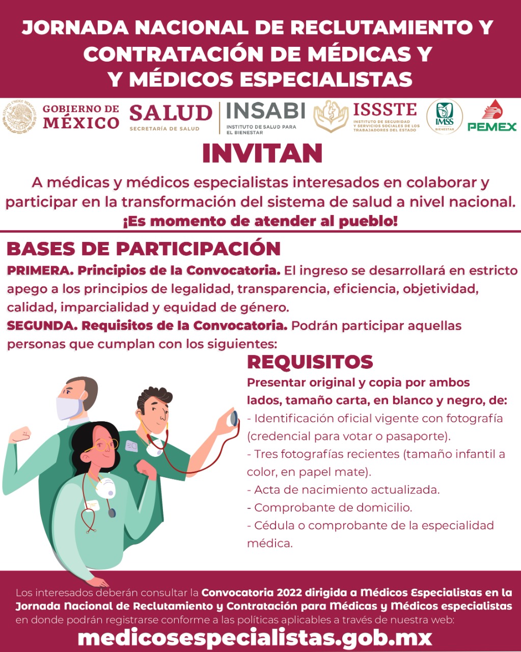 Por instituciones, el requerimiento en territorio nacional es el siguiente: Instituto de Salud para el Bienestar (Insabi), ocho mil 272 en 29 estados; IMSS en Régimen Ordinario, 2 mil 588; IMSS-Bienestar, mil 765; Petróleos Mexicanos (Pemex), 133; y la Comisión Coordinadora de Institutos Nacionales de Salud y Hospitales de Alta Especialidad (CCINSHAE), 28 especialistas.