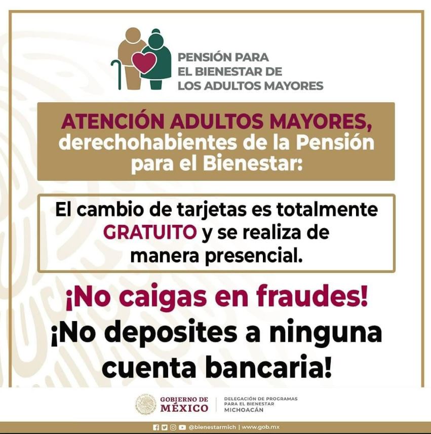 El Gobierno de México, a través de la Delegación de Programas para el Bienestar en Michoacán, informa que continúa el proceso de entrega de tarjetas del Banco del Bienestar a derechohabientes que cobraban su pensión universal en Banamex y alerta a la población sobre intentos de fraude, vía telefónica, a adultos mayores.