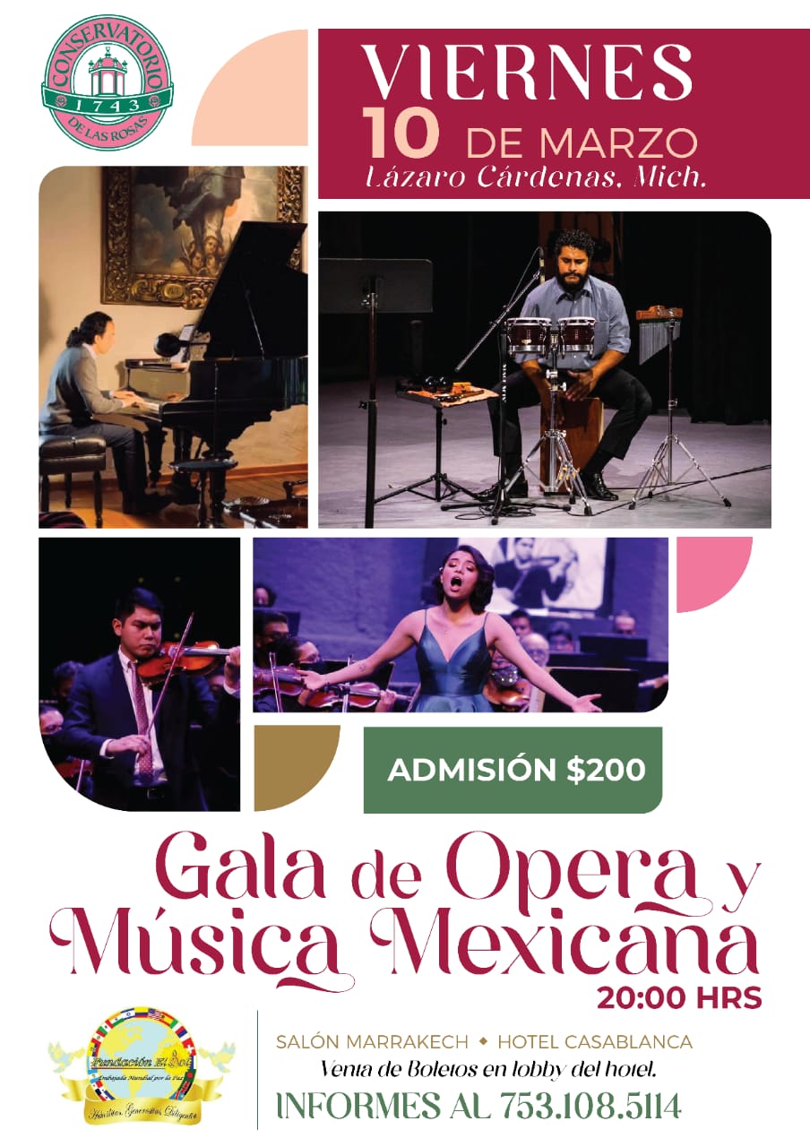 LÁZARO CÁRDENAS, MICH.- Llegará al puerto de Lázaro Cárdenas con Gala de Ópera y Música Mexicana, del Conservatorio de Las Rosas y Fundación El Sol la compañía de ópera, que el próximo viernes 10 de marzo, a partir de las 20:00 horas, presentará en el Salón Marrakech la obra de Gala de Ópera y Música de Mexicana, así lo dio a conocer Sergio Omar García Rodríguez, promotor cultural en Lázaro Cárdenas.