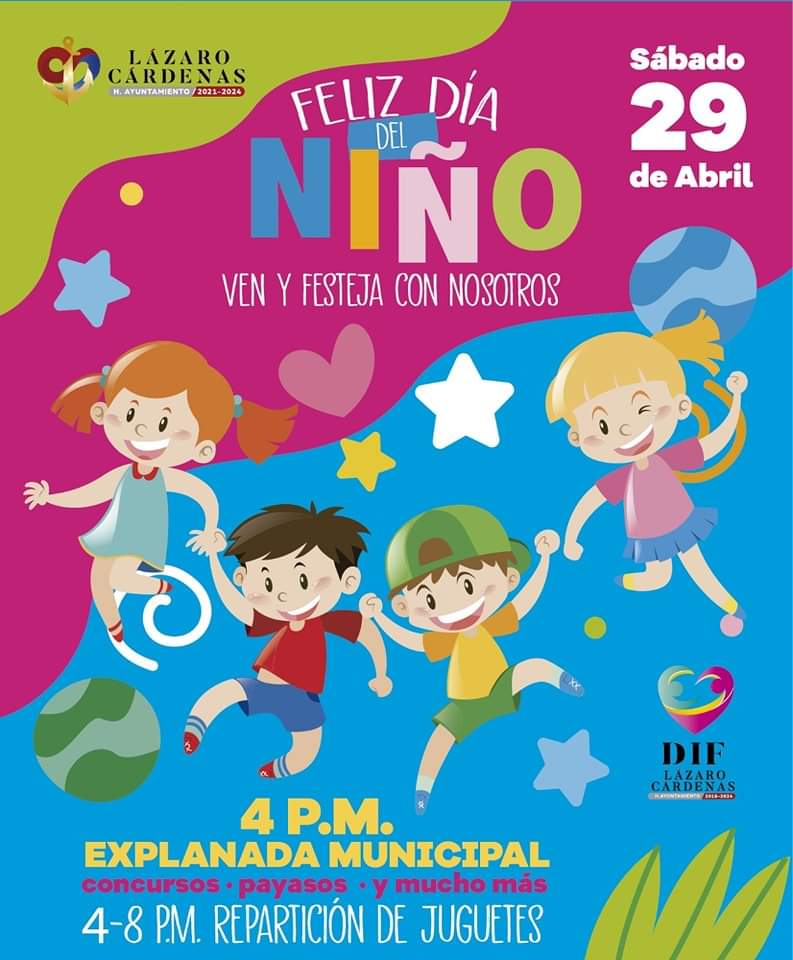 Cd. Lázaro Cárdenas, Mich., a 27 de Abril del 2023.-Este sábado 29 de abril el Gobierno de Lázaro Cárdenas a través del Sistema DIF Municipal, celebrará el Día de los Niños y Niñas con el tradicional Festival de los Niños que se realizará en la Explanada Municipal a partir de las 4 de la tarde.