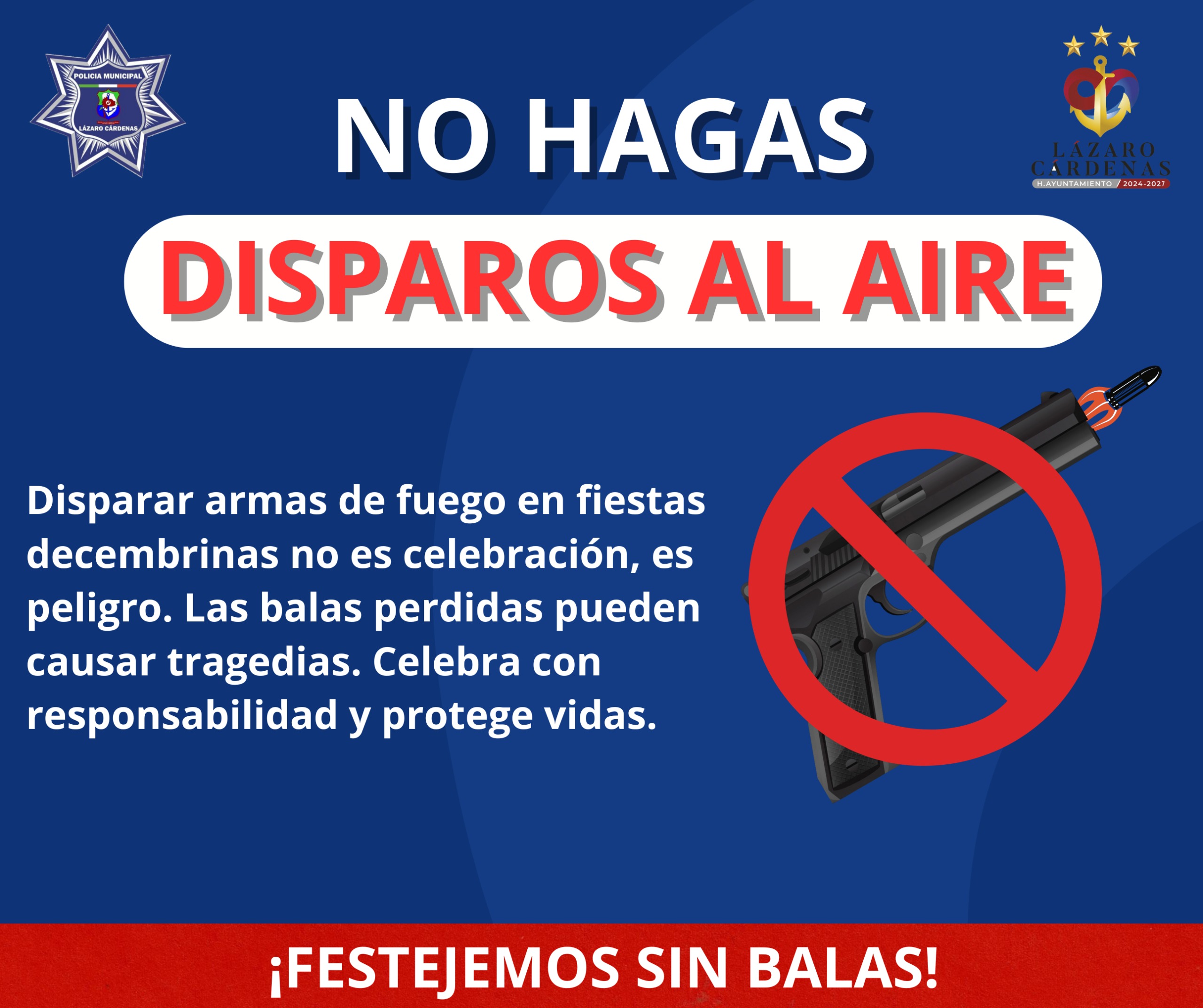 Cd. Lázaro Cárdenas, Mich., 24 de diciembre de 2024.- En el marco de las celebraciones navideñas, el Gobierno Municipal a través de la Dirección de Seguridad Pública Municipal de Lázaro Cárdenas, exhortó un llamado a la ciudadanía para evitar disparos al aire durante las festividades decembrinas.