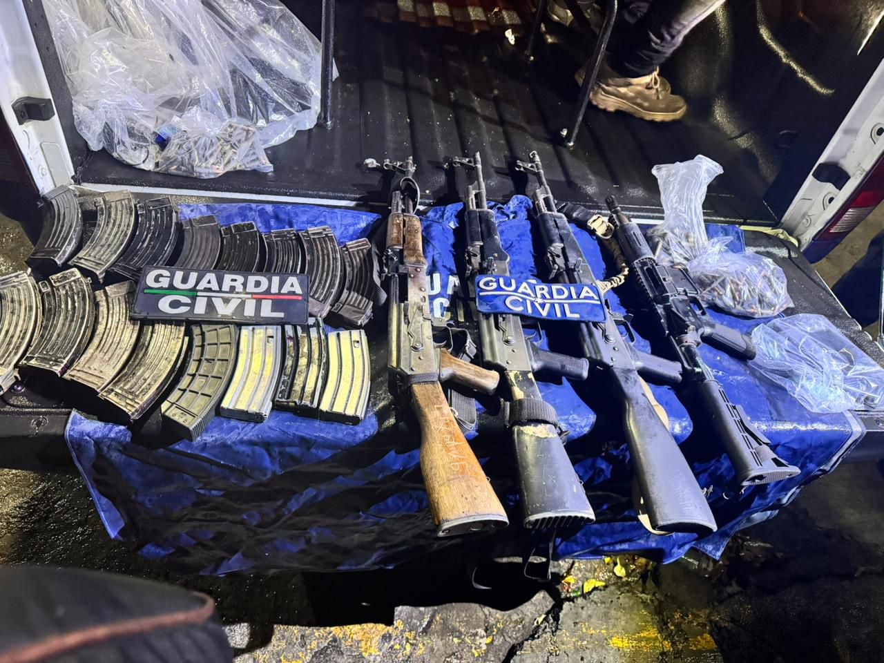 Tras una inspección, al interior de la unidad se encontró a cuatro hombres, mismos que portaban cuatro armas largas calibres 7.62X39 y 223 milímetros, respectivamente; además se les localizaron 16 cargadores, así como 393 municiones, y distintos chalecos tácticos.