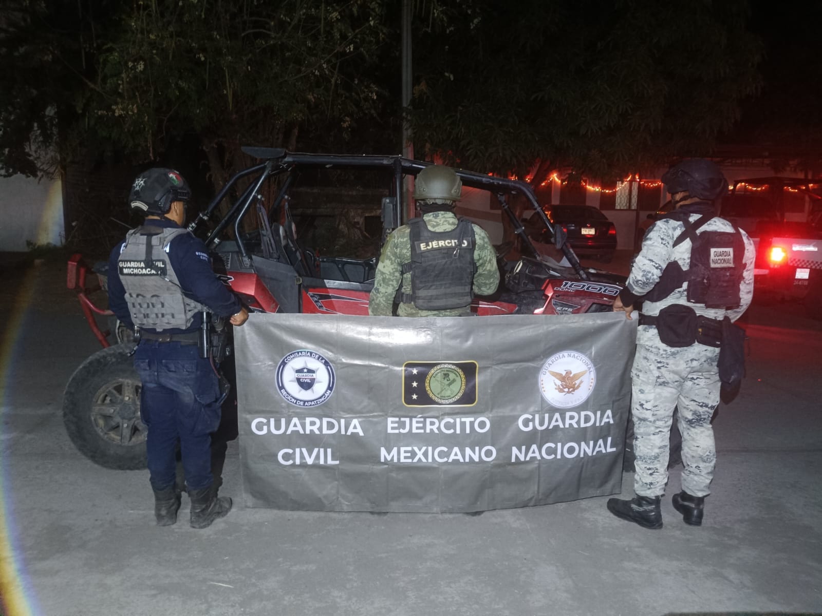 En una primera acción, durante patrullajes de reconocimiento en la localidad de Santa Ana Amatlán, agentes de la Guardia Civil, Ejército Mexicano y GN, ubicaron un Rzr marca Polaris con reporte de robo; además de un arma larga calibre 5.56×45 milímetros, 60 municiones, cargadores y equipo táctico.