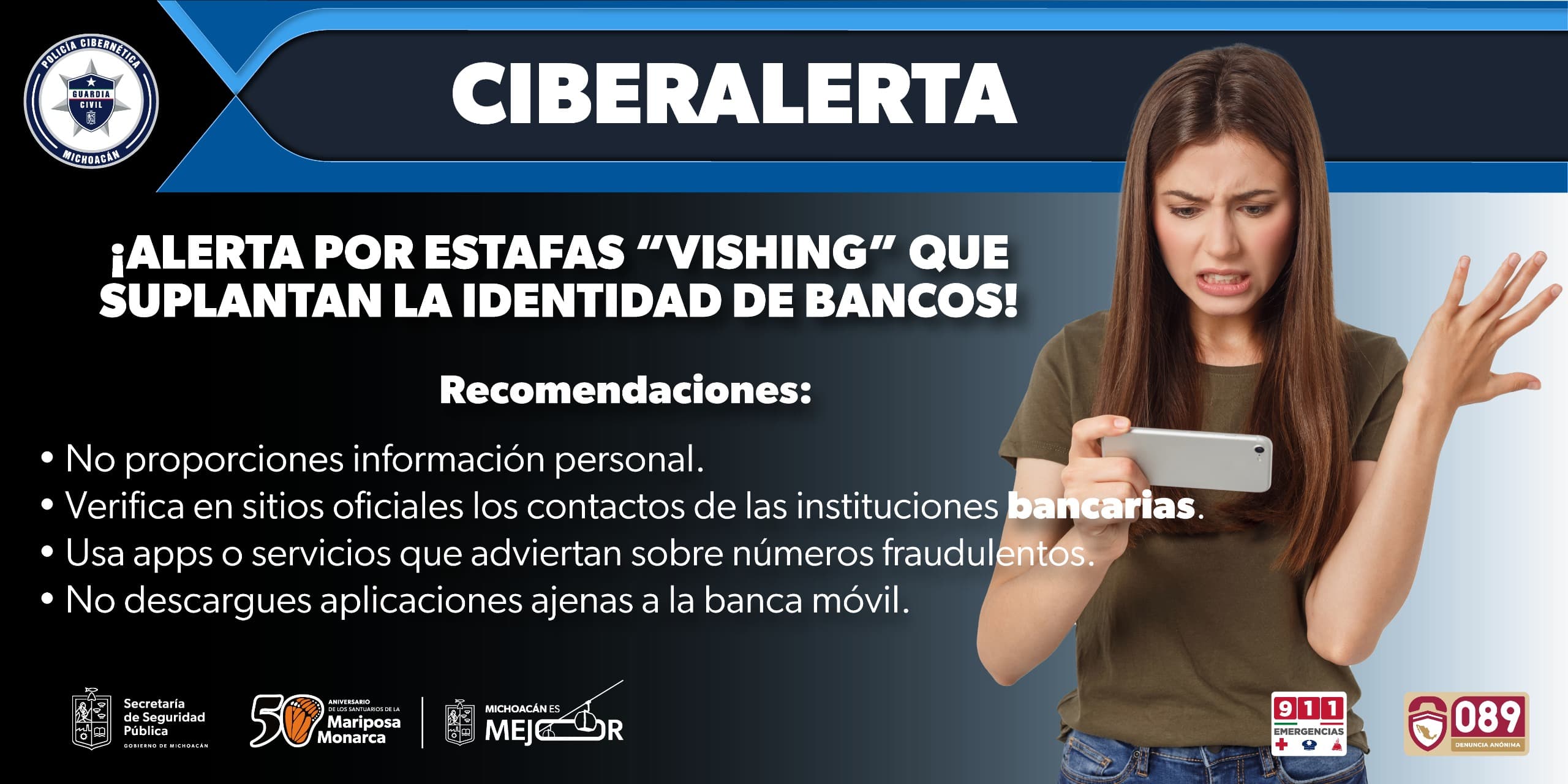 Morelia, Michoacán, 4 de febrero de 2025.- Con el objetivo de brindar información oportuna para la prevención de ciberdelitos que vulneren la integridad de la ciudadanía, la Secretaría de Seguridad Pública (SSP), emite la siguiente alerta sobre fraudes bancarios.