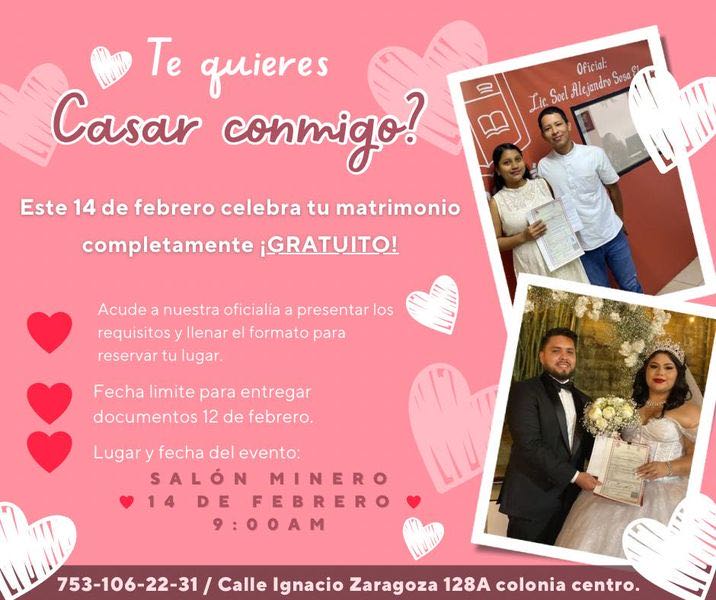 LÁZARO CÁRDENAS, MICH.- Ahora sí no hay pretextos para DAR EL SÍ ¿Sabías que se realizarán matrimonios simultáneos en el Salón Minero? El próximo 14 de febrero, Día del Amor y la Amistad, se celebrará una boda masiva en todo el estado y el trámite es completamente gratis, confirmó este día la Oficial del Registro Civil Número 06 Eliazar Cuevas Ortega y Soel Alejandro Sosa Elorza, Oficial del Registro Civil.