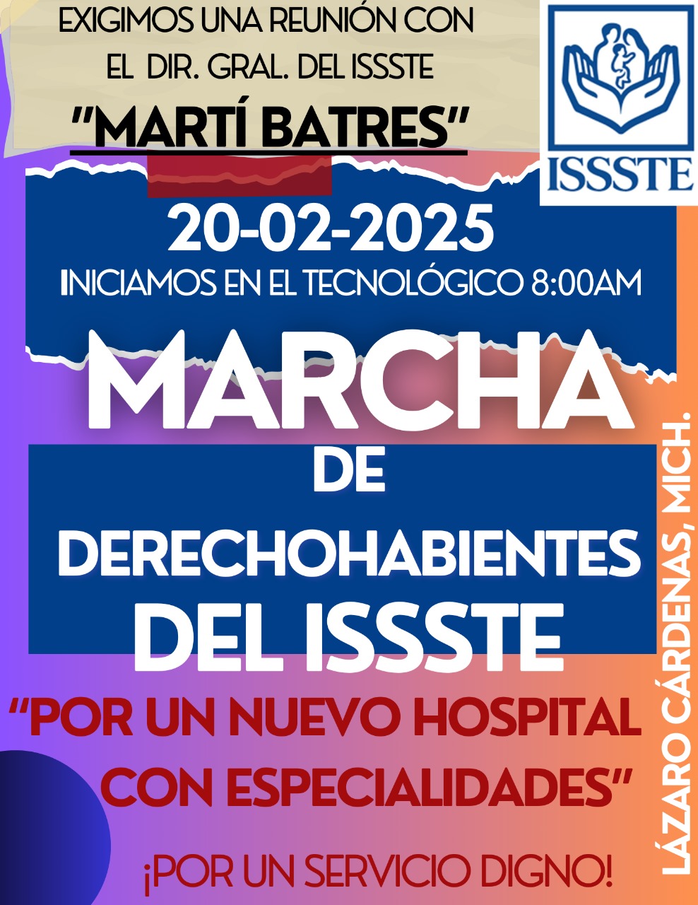 LÁZARO CÁRDENAS, MICH.- Maestros de la Sección 18 de Michoacán, SNTE y CNTE, así como del vecinos Estado de Guerrero, Trabajadores de la Salud, Jubilados y Pensionados derechohabientes de la clínica médica del ISSSTE, ubicada en esta cabecera municipal, este jueves 20 de febrero saldrán a marchar por lo que se pide a transportistas extremar precauciones, al circular sobre la avenida Melchor Ocampo, y busquen vías alternas.