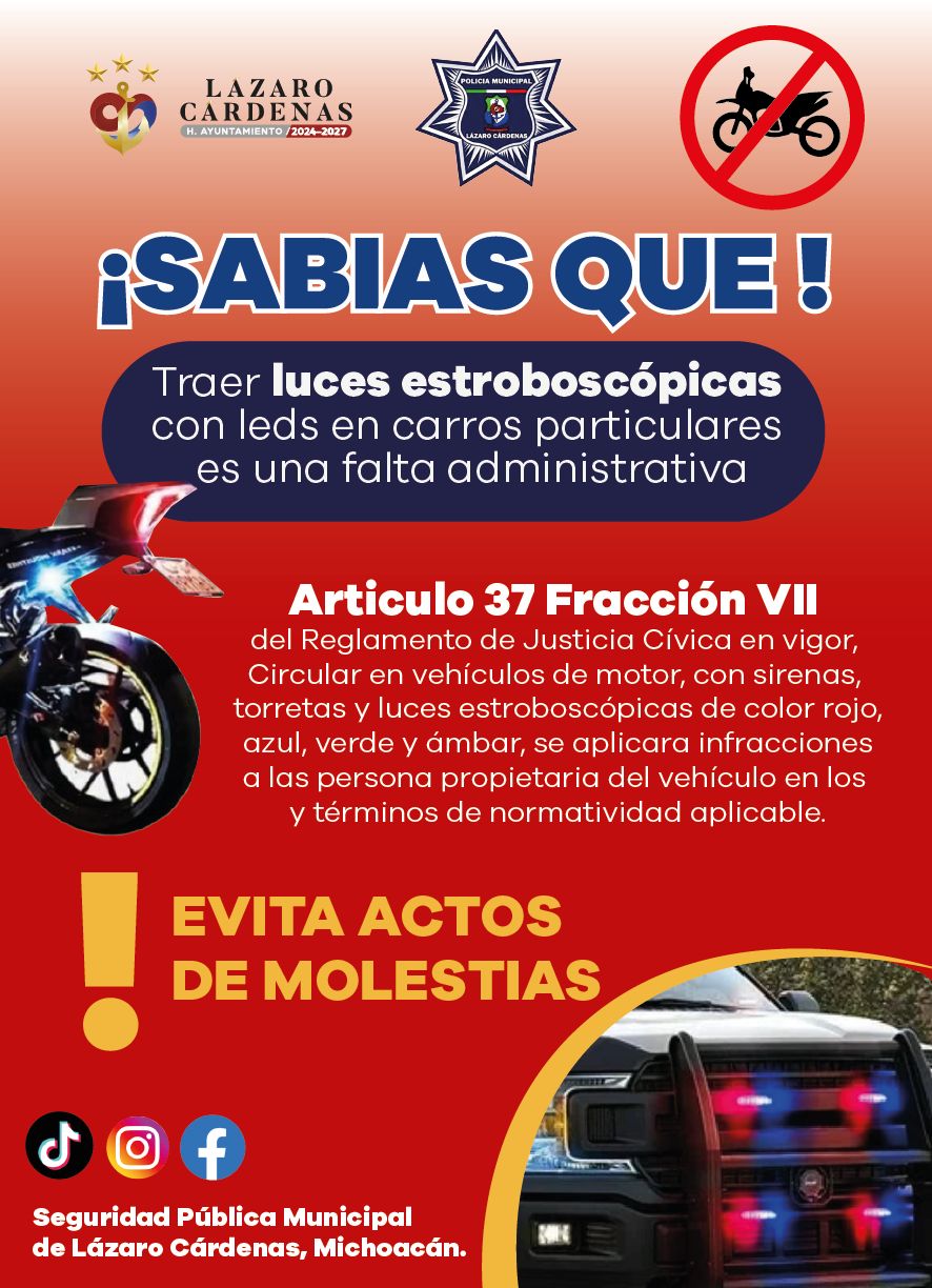 Cd. Lázaro Cárdenas, Mich., a 24 de Febrero de 2025.- Dando respuesta a las denuncias que la ciudadanía ha realizado en torno a dificultades viales; este martes el Gobierno Municipal a través de la Dirección de Seguridad Pública Municipal, dará inicio al Operativo de Ordenamiento Vial en la avenida Lázaro Cárdenas, con el cual se dará vigilancia a los camiones de carga pesada y motocicletas, así como todo aquel vehículo con luces estroboscópicas.