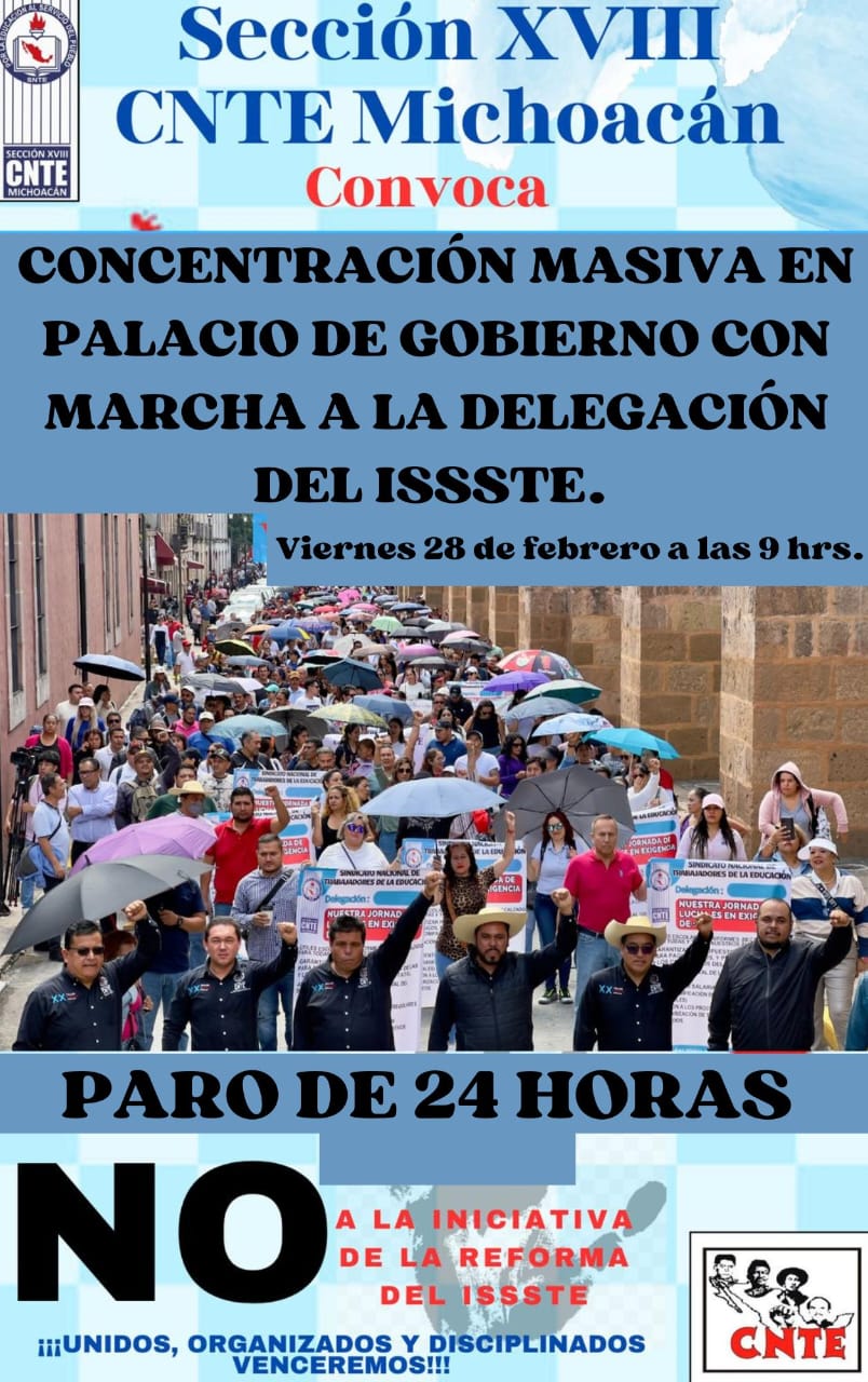 La Sección XVIII de la CNTE convocó al 100 por ciento de la membresía, es decir los más de 30 mil agremiados en el estado de Michoacán para que este 27 y 28 de febrero participen en la jornada de movilización, para ello el 50 por ciento de los trabajadores michoacanos deberán movilizarse este viernes 28 en la capital del estado y visitar el Congreso Local de la Legislación LXVI y pedir a los diputados no aprobar esta iniciativa.