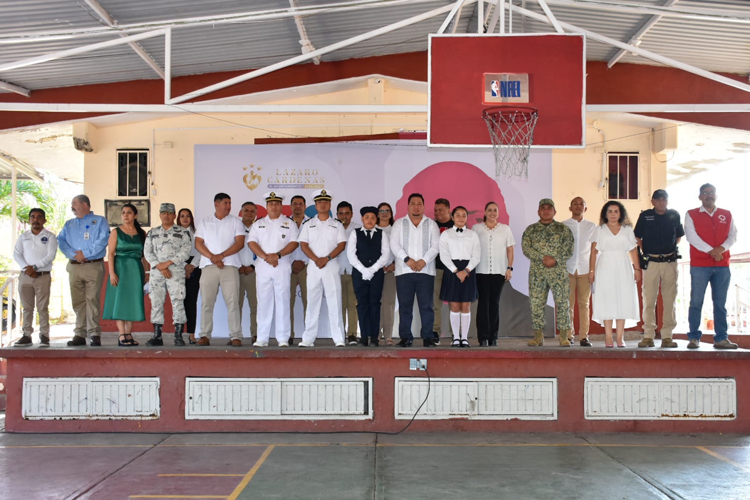 Ante la presencia del Presidente Municipal, Manuel Esquivel Bejarano, el acto cívico dio inicio con los honores a la bandera, que estuvieron acompañados por la escolta de la Escuela Primaria Justo Sierra y de la banda guerra del 82º Batallón de Infantería; asi como del maestro de canto Omar Melchor Melchor.