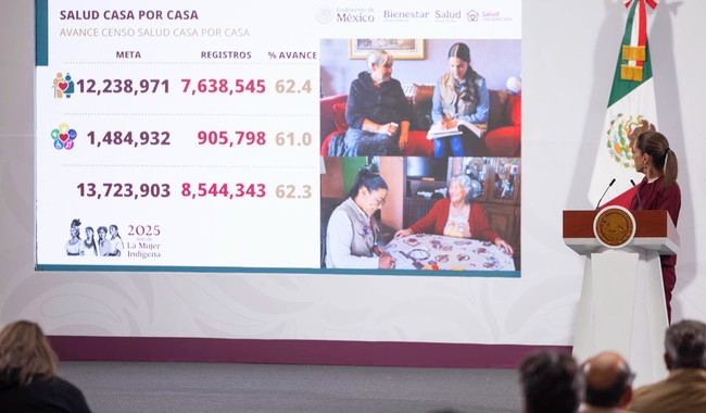 Ciudad de México, 12 de mayo de 2025.- En el Día Internacional de la Enfermería, la Presidenta de México, Claudia Sheinbaum Pardo, resaltó que, hasta la fecha, a través del Censo Salud y Bienestar del programa Salud Casa por Casa se ha visitado a 8.5 millones de adultos mayores y personas con discapacidad, lo que representa un avance del 62.3 por ciento respecto a la meta total.