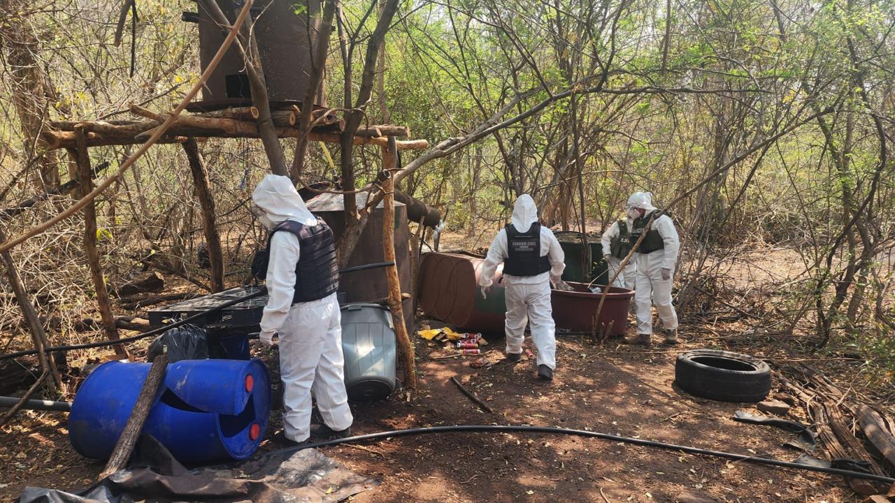 Las tareas operativas realizadas en la localidad de Los Olivos, permitieron a los elementos de la Guardia Civil, Ejército Mexicano y Guardia Nacional, ubicar un predio utilizado presuntamente para la fabricación de metanfetamina. La zona fue asegurada y se desplegó un perímetro para llevar las actuaciones correspondientes.