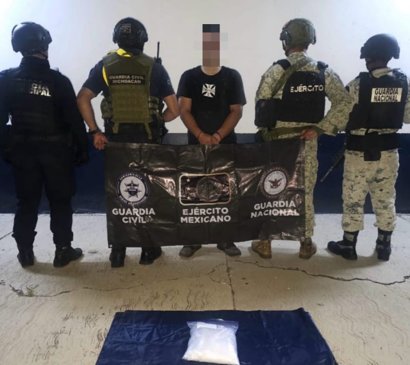 Apatzingán, Michoacán, 15 de agosto de 2025.- Como resultado de las acciones que forman parte del esquema preventivo Operación Apatzingán, los elementos de las secretarías de Seguridad Pública (SSP) y de la Defensa Nacional (Defensa), detuvieron a un hombre en portación de más de un kilogramo de metanfetamina.