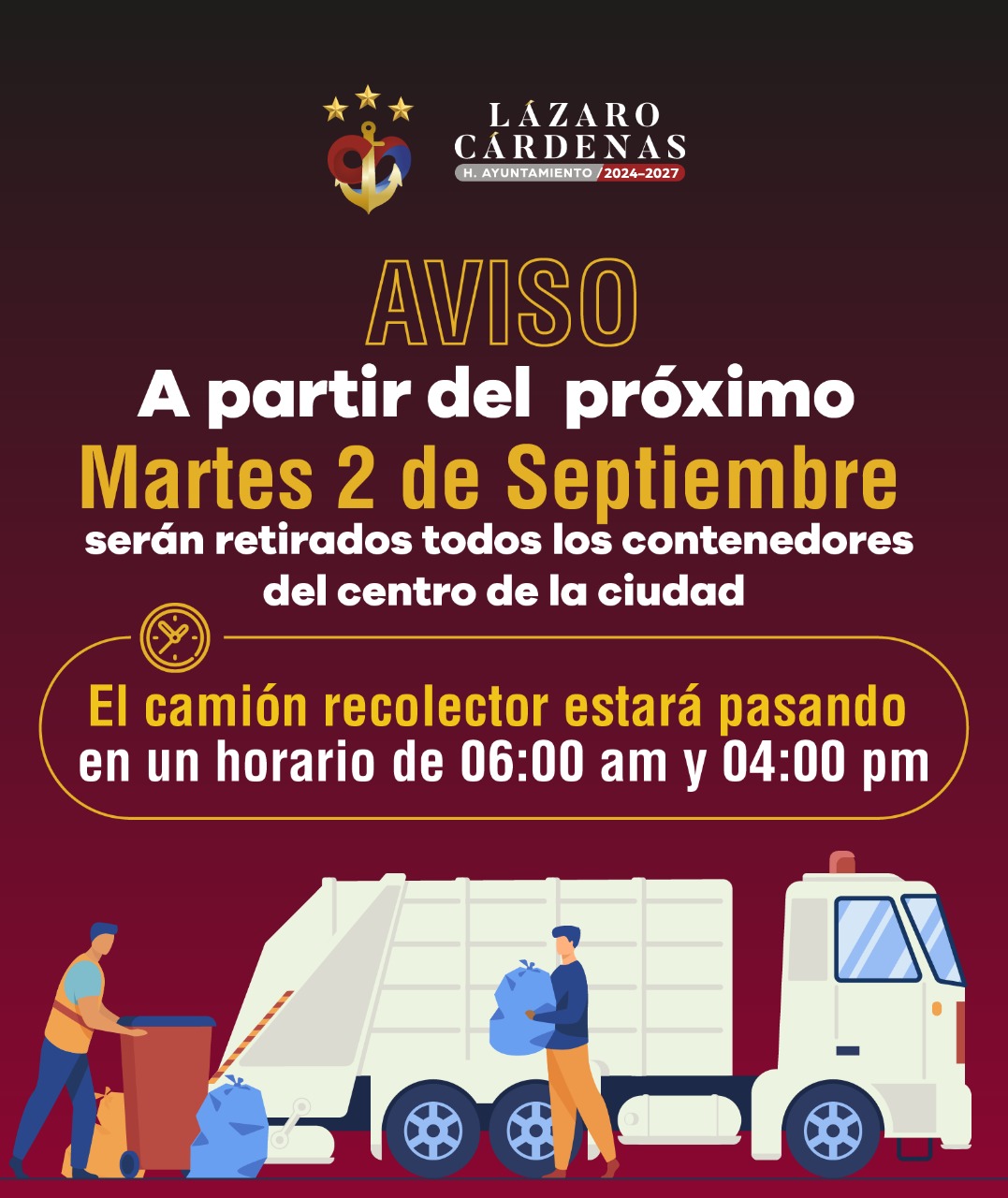Cd. Lázaro Cárdenas, Mich., a 28 de agosto de 2025.- El Gobierno Municipal informó que el próximo 2 de septiembre se concluirá con el retiro de los últimos contenedores de basura ubicados en el centro de la ciudad.