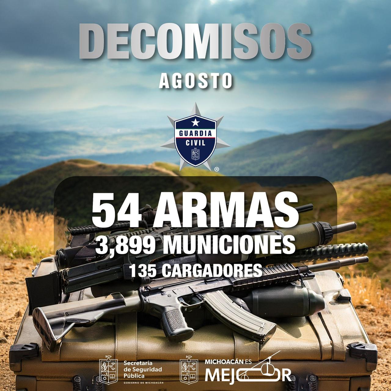Resultado de los operativos coordinados entre la Guardia Civil, la Secretaría de la Defensa Nacional (Defensa) y autoridades estatales, se logró el decomiso de 30 armas largas y 24 cortas, además de 135 cargadores y 3 mil 899 municiones.