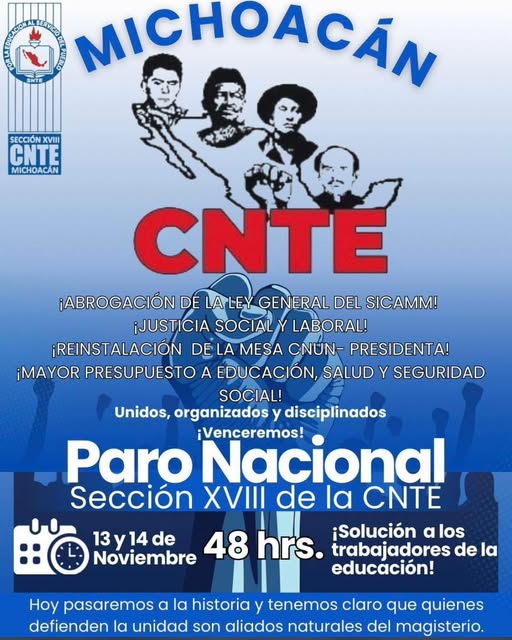 Este jueves 13 estarán llevando a cabo toma de presidencias municipales en todo el estado, como parte del paro de 48 horas, el viernes una mega marcha estatal en la capital del estado, con comisiones representativas donde los maestros que no puedan acudir a Morelia mantendrán toma de palacios en sus comunidades en apoyo y respaldo al paro de 48 horas y la marcha en el estado, haciendo una invitación a las expresiones magisteriales a que se sumen y hacer un solo bloque.