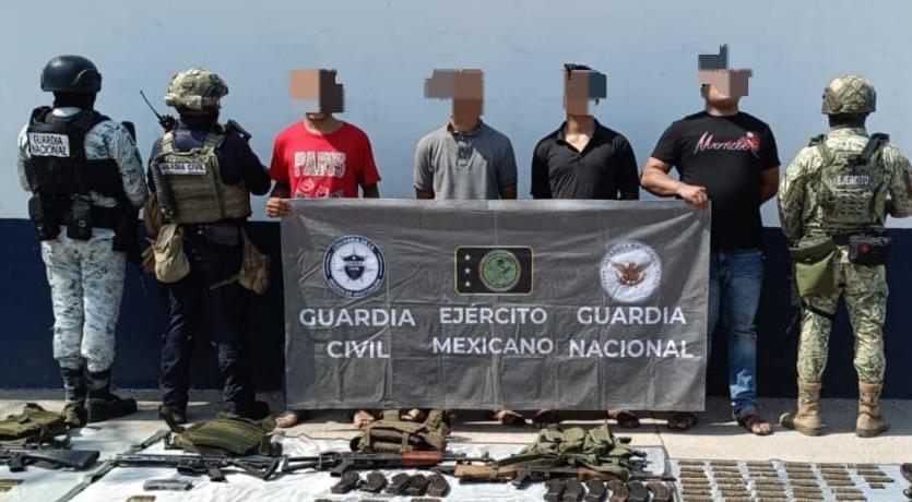 En el primer hecho, agentes de la Guardia Civil, Ejército Mexicano y la Guardia Nacional realizaban patrullajes preventivos efectuados en la colonia Del Seguro, donde llevaron a cabo el aseguramiento de cuatro hombres, entre los que se encontraban dos menores de edad, quienes llevaban consigo cuatro fusiles de los calibres 7.62X39 y 5.56X45 milímetros. También se les decomisaron mil 220 municiones, cargadores y chalecos con distintivos de un grupo criminal.