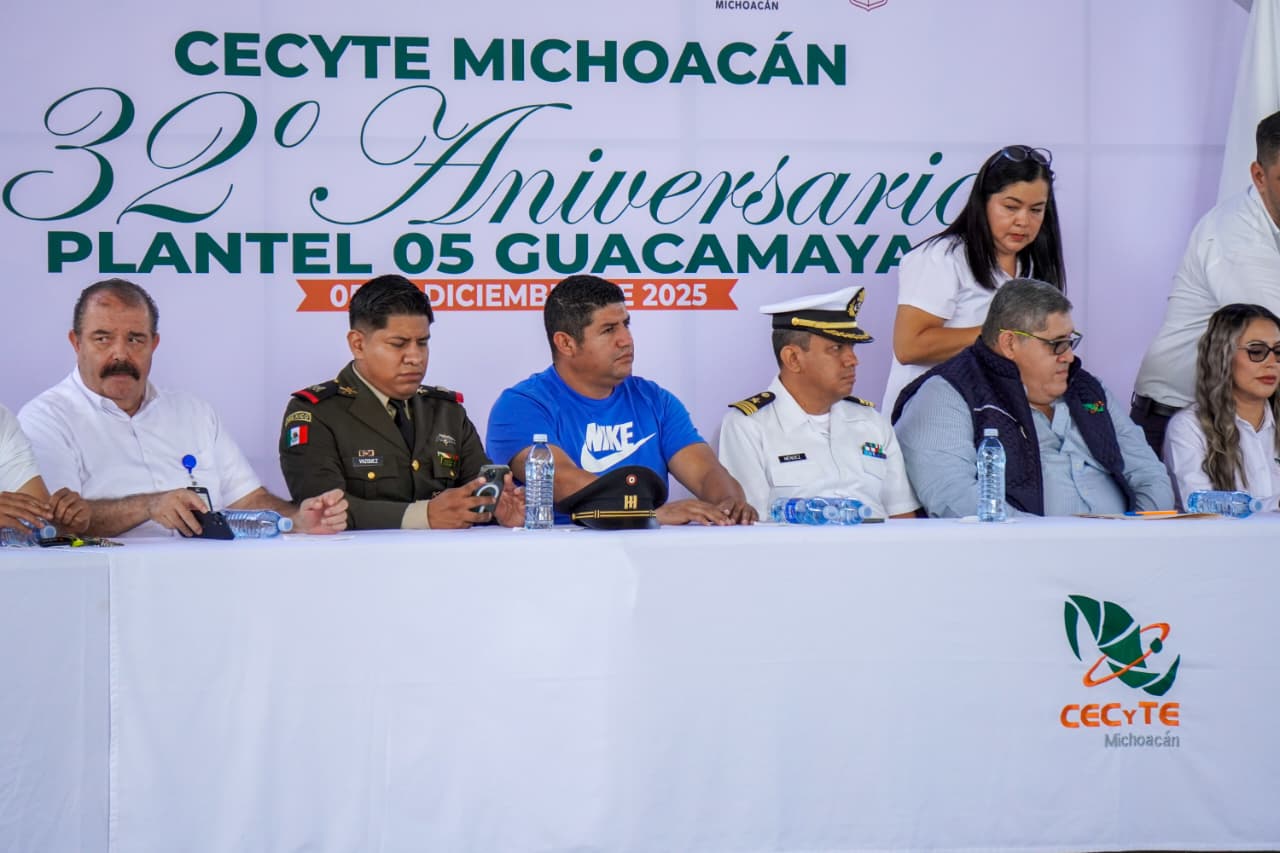 Cd. Lázaro Cárdenas, Mich., a 05 de Diciembre del 2025.- Ante la presencia de autoridades navales, militares y municipales, así como la comunidad docente y estudiantil, este viernes se celebró el 32º aniversario del Cecyte Michoacán Plantel 05 Las Guacamayas, quienes destacaron el papel que ha tenido esta institución en la formación académica de los futuros profesionistas.