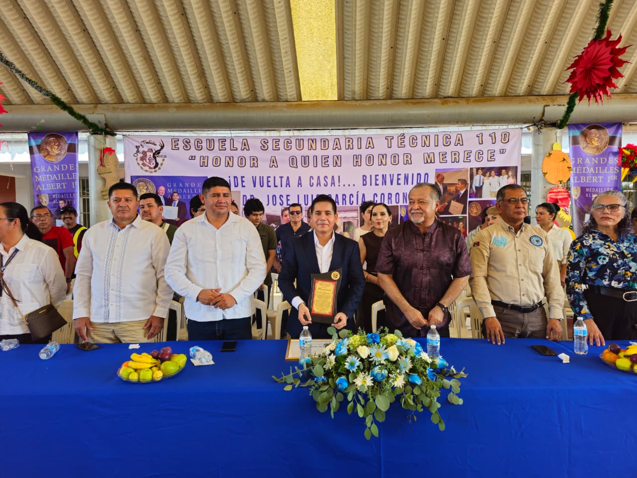 Cd. Lázaro Cárdenas, Mich., a 17 de Diciembre del 2025.- Este miércoles, el Gobierno Municipal participó en la ceremonia que la Escuela Secundaria Técnica 110° realizó al Dr. José Luis García Corona, ex alumno egresado de esta institución y quien recientemente fue el primer mexicano en recibir la «Medalla Primer Príncipe de Mónaco», un prestigioso premio que otorga el Instituto Oceanográfico por contribuciones a la protección y conocimiento de los océanos.