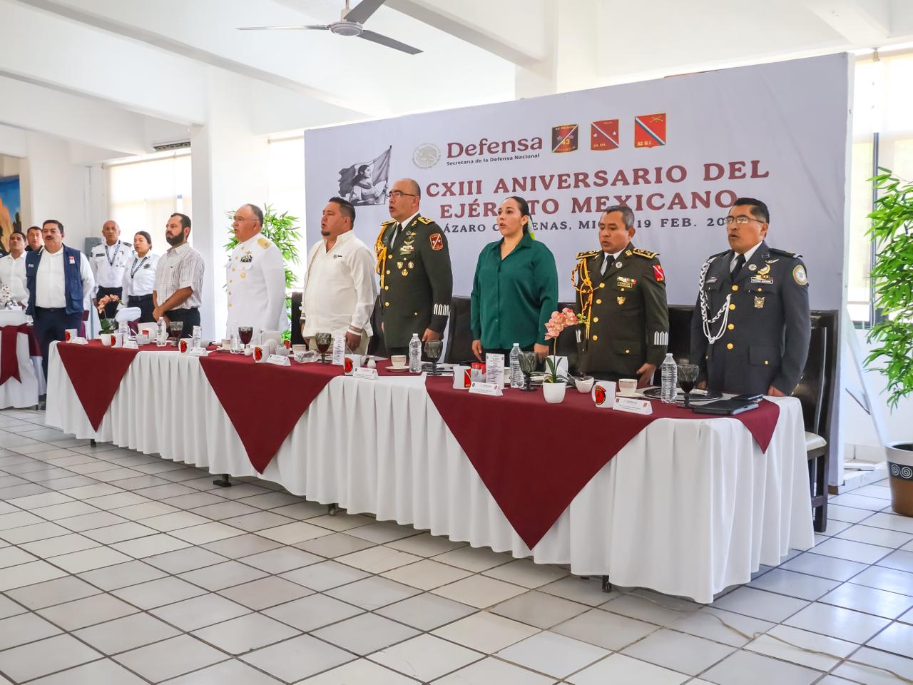 En este acto estuvieron presentes el General Brigadier de Estado Mayor, Marcos Alonso Gastélum Antuna, Comandante de la Guarnición Militar de esta plaza; el Presidente Municipal de Lázaro Cárdenas, Manuel Esquivel Bejarano; la Presidenta Municipal de Arteaga, Wendoly Alejandra Avellaneda Torres; el Presidente Municipal de Tumbiscatío de Ruiz, Apolonio Hureña Martínez; el Contralmirante Cuerpo General Diplomado de Estado Mayor, Rogelio de Jesús Chávez Heredia, Jefe de Estado Mayor de la Décima Sexta Zona Naval, y el Capitán Primero de la Guardia Nacional, Rafael Chávez Nicolás, Comandante de la 485 compañía.